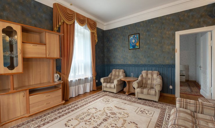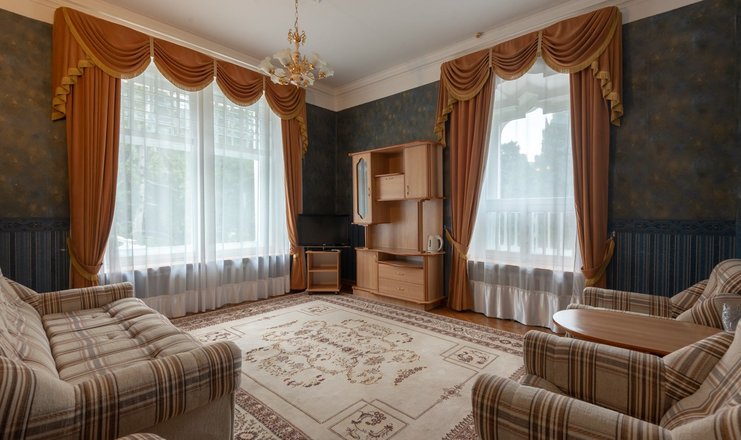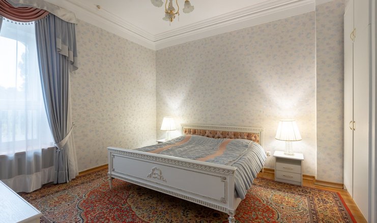 Площадь номера - 42 кв.м. 2 осн. места. 2 доп. места. Мебель: зеркало, кресло, кровать двуспальная, прикроватные тумбочки, стол, стулья, шкаф. Оборудование: кондиционер, набор посуды, телевизор, холодильник, электрочайник. Санузел: с ванной/душем, тапочки, туалетные принадлежности, фен, халат. Сервис: Wi-Fi бесплатно, смена полотенец, смена постельного белья, уборка номера.